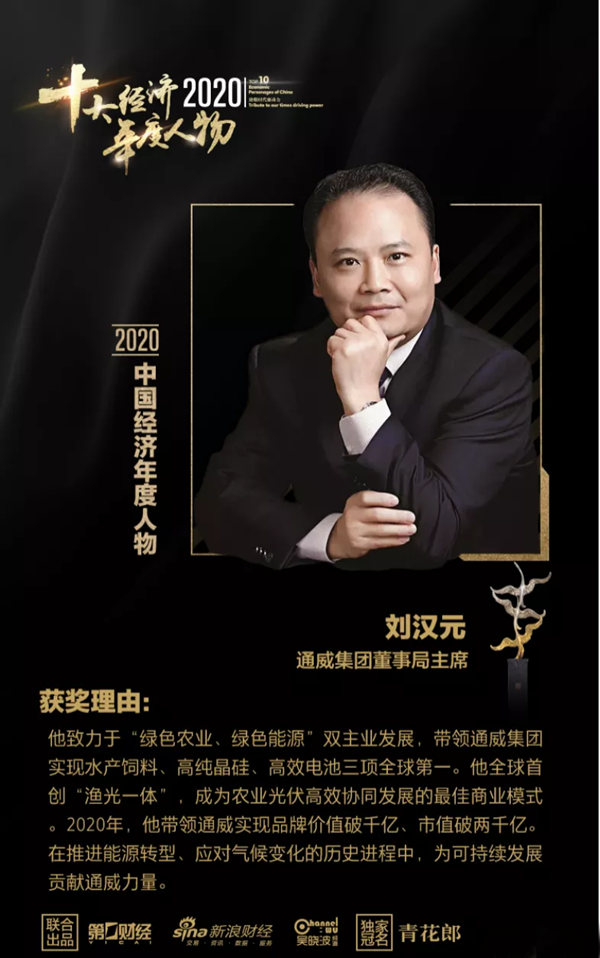 2月8日,由第一財經、新浪財經、吳曉波頻道聯合出品的“2020十大經濟年度人物評選”隆重揭曉,通威集團董事局劉漢元主席榮膺“2020十大經濟年度人物”殊榮。