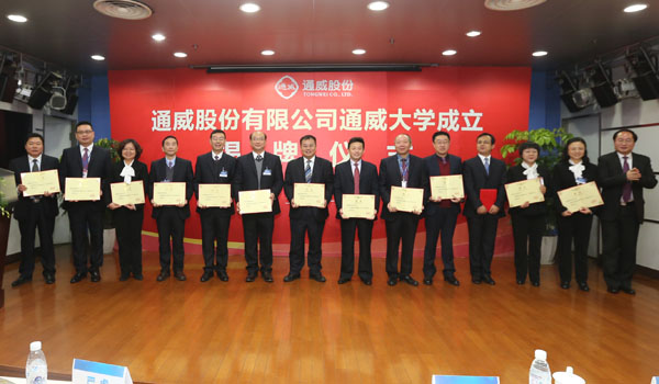 隨后,劉主席、嚴總一同為“通威大學”的成立揭牌剪彩,隨著鮮艷的紅綢緩緩揭起,現場雷鳴般的掌聲詮釋了通威人內心的激動與興奮,這一刻意味著通威人有了自己的成長家園,行業增添了夢想實現的天地;這一刻揭開了通威人用“培養精英、創造精品”的理念,邁向實現“將軍的搖籃”的偉大愿景。會上,聘任了一批通威大學“首席專家”和“專家級講師”。