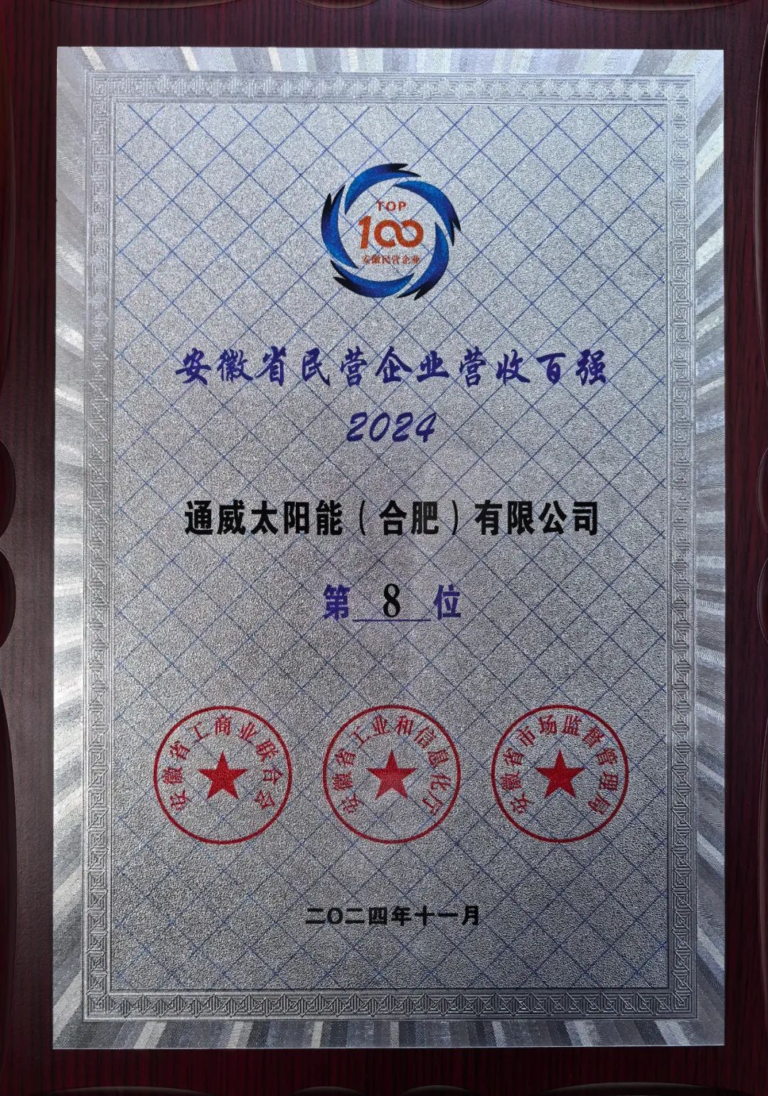 通威太陽能(合肥)有限公司連續8年榮列安徽省民營企業營收百強、制造業百強企業榜單