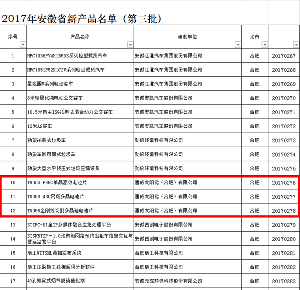 通威太陽能(合肥)有限公司三項產(chǎn)品成功入列2017年安徽省新產(chǎn)品(第三批)榜單