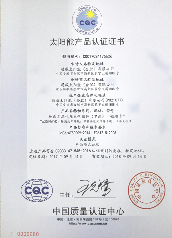 通威太陽能(合肥)有限公司榮獲地面用光伏組件“領(lǐng)跑者”認(rèn)證