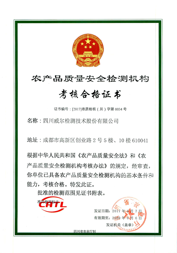 四川威爾檢測喜獲農產品質量安全檢測機構考核合格證書