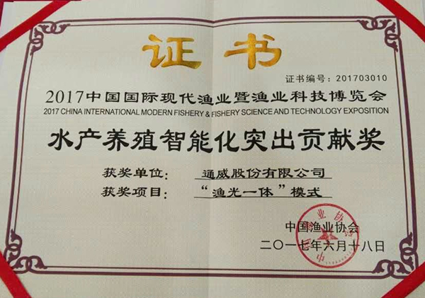 通威“漁光一體”模式榮獲“水產養殖智能化突出貢獻獎”