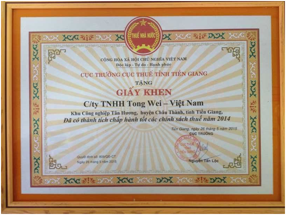 越南通威獲“2014年度稅務政策和納稅義務執行優秀企業”稱號