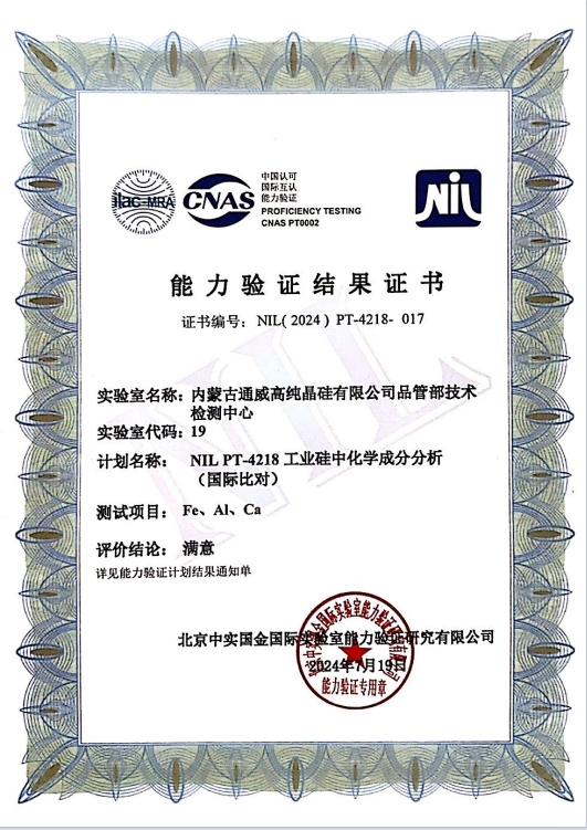 內蒙古通威工業硅化學成分分析獲得國家專業機構認可