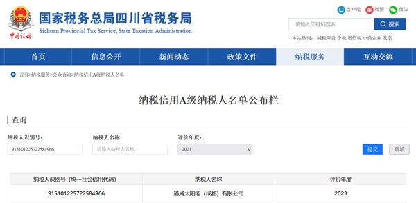 通威太陽能(成都)有限公司連續九年榮膺“A級納稅人”稱號