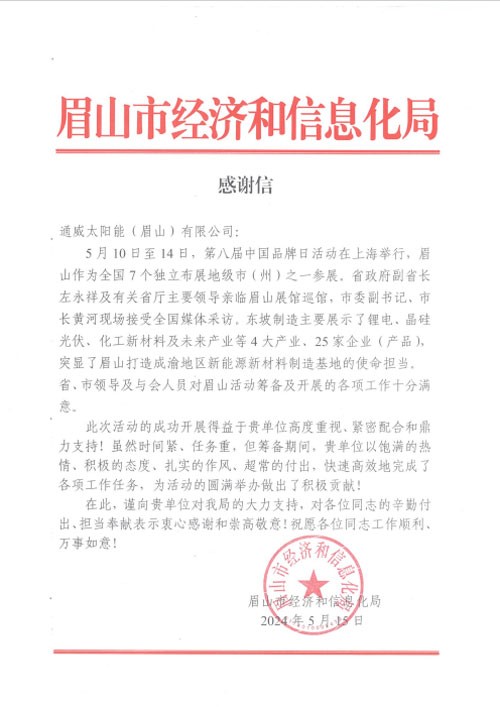 點贊!通威太陽能(眉山)有限公司收到眉山市經濟和信息化局感謝信