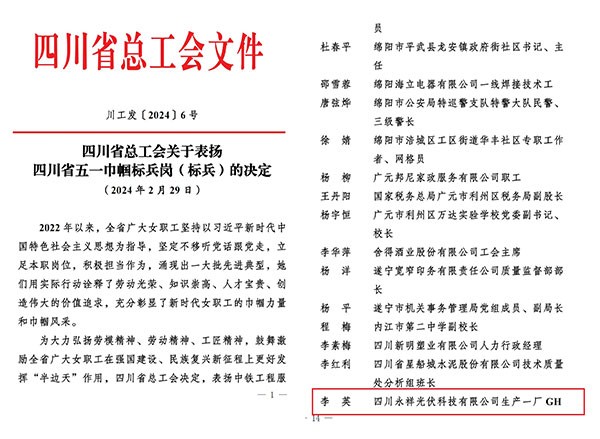 永祥光伏科技李英榮獲四川省五一巾幗標兵