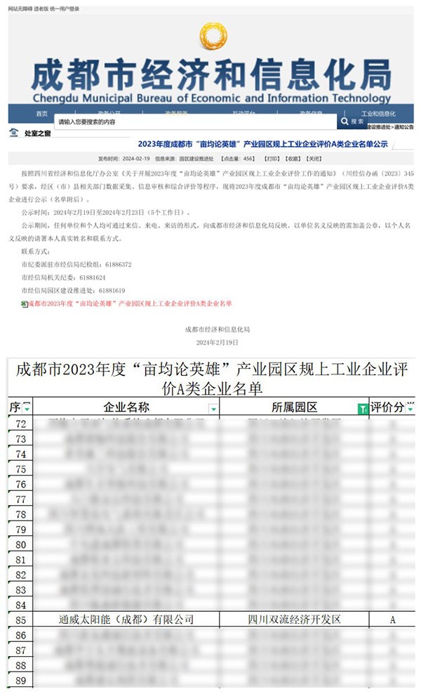 通威太陽能雙流基地、眉山基地、通合項目分別榮列2023年度“畝均論英雄”產業園區規上工業企業評價A類企業
