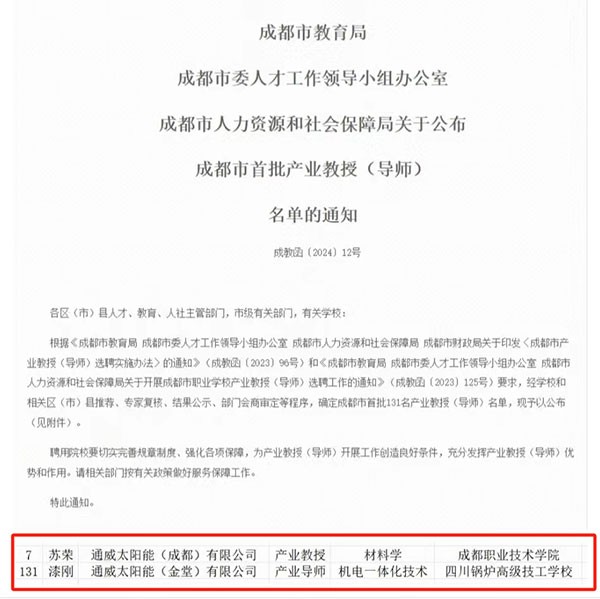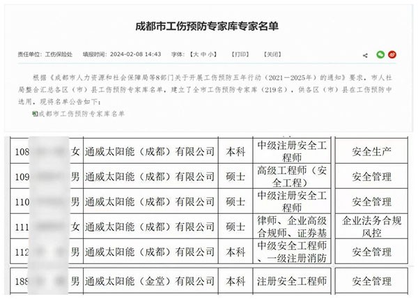 通威太陽能6名專家成功入選成都市工傷預防專家庫