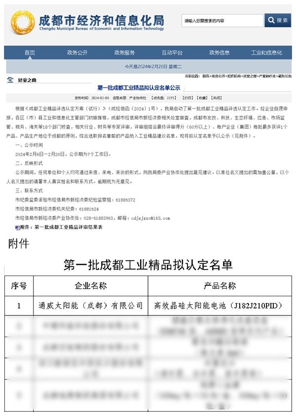 通威太陽能雙流基地榮獲“第一批成都工業精品”稱號