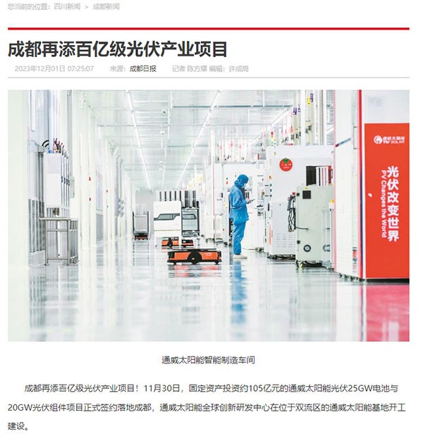 四川新聞網、成都電視臺、成都日報等多家媒體聚焦通威太陽能新發展新項目