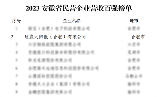通威太陽能(合肥)有限公司榮登2023年度安徽省民營企業雙百強榜單