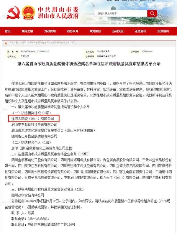 通威太陽(yáng)能眉山基地榮獲“第六屆眉山市政府質(zhì)量獎(jiǎng)”