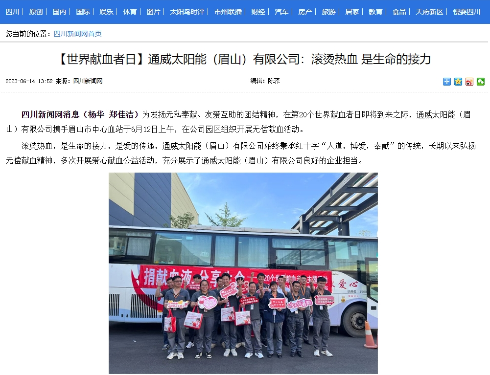 四川新聞網、雙流發布聚焦通威太陽能員工積極參與愛心獻血公益活動