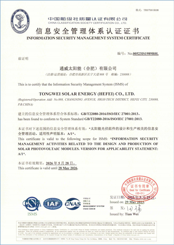 通威太陽能(合肥)有限公司榮獲 ISO/IEC 27001信息安全管理體系認(rèn)證證書