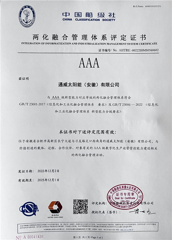 通威太陽能(安徽)有限公司順利通過國家兩化融合管理體系貫標(biāo)評定AAA級評定