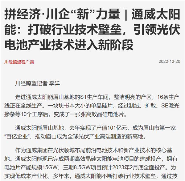 四川經(jīng)濟(jì)日報聚焦通威太陽能技術(shù)創(chuàng)新與發(fā)展