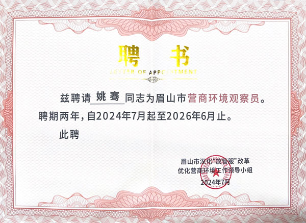 通威太陽能(眉山)有限公司總經(jīng)理姚騫被聘為 “眉山市營商環(huán)境觀察員”