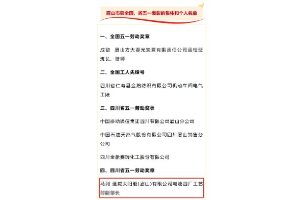為在全社會大力弘揚(yáng)勞模精神、勞動精神、工匠精神,激勵廣大職工在全面建設(shè)社會主義現(xiàn)代化四川新征程中充分發(fā)揮主力軍作用,近日,四川省總工會組織評選了在我省經(jīng)濟(jì)建設(shè)、政治建設(shè)、文化建設(shè)、社會建設(shè)、生態(tài)文明建設(shè)和黨的建設(shè)中涌現(xiàn)的先進(jìn)集體和先進(jìn)職工,通威太陽能(眉山)有限公司電池四廠工藝部副部長馬列榮獲“四川省五一勞動獎?wù)隆北碚谩?/span>