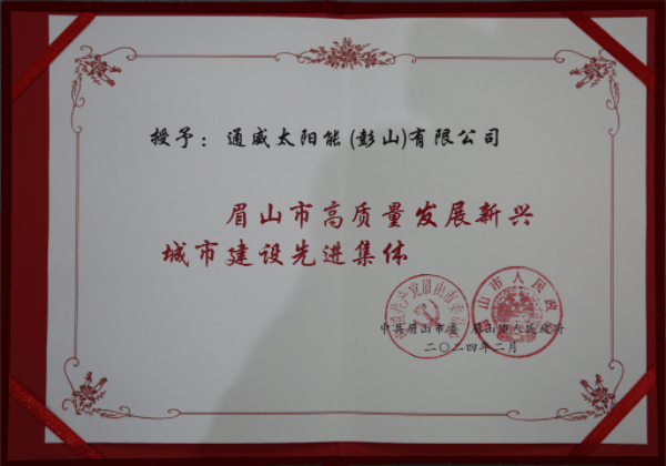 近日,通威太陽能(彭山)公司被授予“眉山市高質(zhì)量發(fā)展新興城市建設(shè)先進(jìn)集體”的榮譽(yù)稱號(hào)。這一榮譽(yù)不僅凸顯了彭山公司在眉山天府新區(qū)的杰出表現(xiàn),也充分展示了彭山公司在推動(dòng)眉山市高質(zhì)量發(fā)展和新興城市建設(shè)方面邁出的堅(jiān)實(shí)的步伐和取得的顯著成就。
