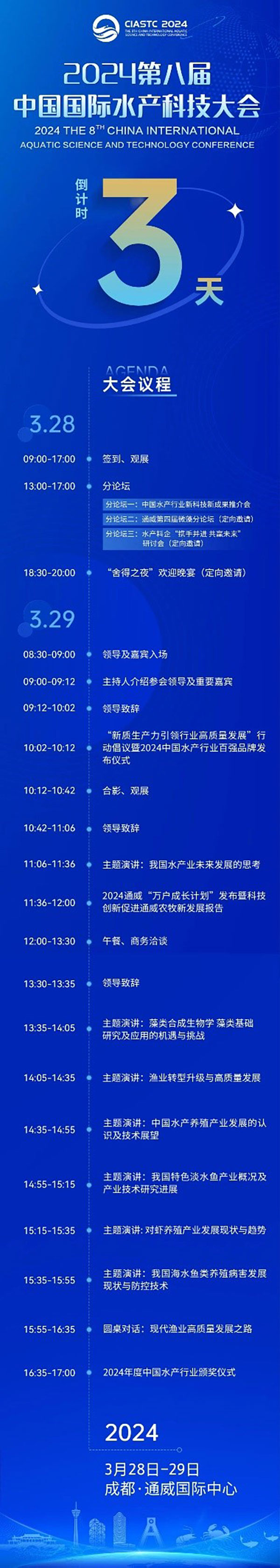 3月28-29日2024第八屆中國國際水產科技大會將在成都通威國際中心隆重舉行大會期間來自中央、省、市政府部門及行業(yè)協會重要領導、行業(yè)專家、領袖企業(yè)家及企業(yè)精英將齊聚一堂探討水產行業(yè)可持續(xù)發(fā)展道路讓世界聽到中國水產聲音賦能全球水產行業(yè)高質量發(fā)展