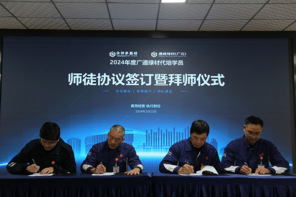 近日,永祥新材料成功舉行廣通綠材代培項目師徒協議簽訂暨拜師儀式。永祥新材料副總工程師吳銘生、總經理助理唐祝軍、相關部門負責人,廣通綠材生產準備組部長助理張小強出席,帶教師傅及培訓學員參加本次活動。