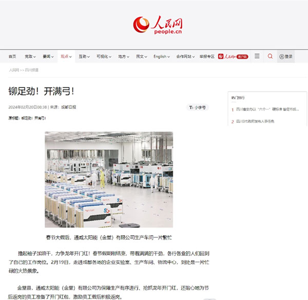 人民網、四川新聞網、成都日報等多家媒體聚焦通威太陽能春節節后復工復產場景