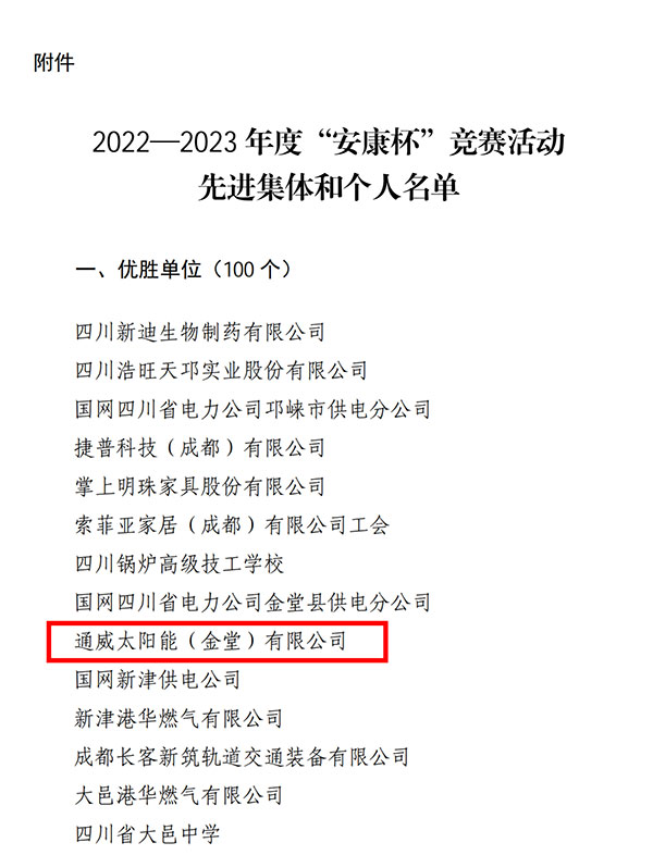 近日,成都市總工會、成都市應(yīng)急管理局、成都市衛(wèi)生健康委員會聯(lián)合發(fā)布《關(guān)于通報表揚2022-2023年度成都市“安康杯”競賽先進集體和個人的通知》,通威太陽能金堂基地榮獲2022-2023年度成都市“安康杯”競賽優(yōu)勝單位稱號。