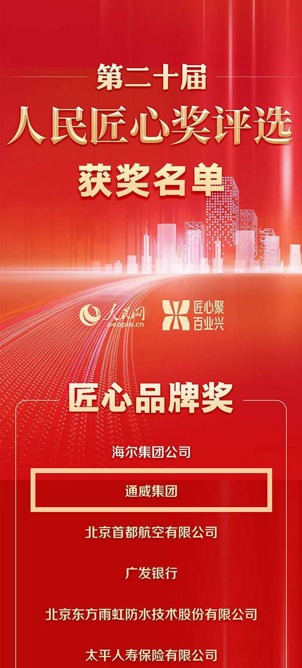 作為論壇重磅活動之一,“第二十屆人民匠心獎”獲獎名單揭曉。第二十屆人民匠心獎評選活動從2023年10月正式啟動,征集了2023年度各行業、各領域優質的產品、技術、服務與解決方案,經“報名征集”“案例初評”“網絡投票”“專家評審”“社會公示”等環節,最終評選出人民匠心飛躍獎、人民匠心服務獎、人民匠心技術獎、人民匠心產品獎、人民匠心品牌獎五大獎項。通威集團憑借強勁的發展實力和品牌影響力榮膺“匠心品牌獎”。