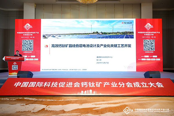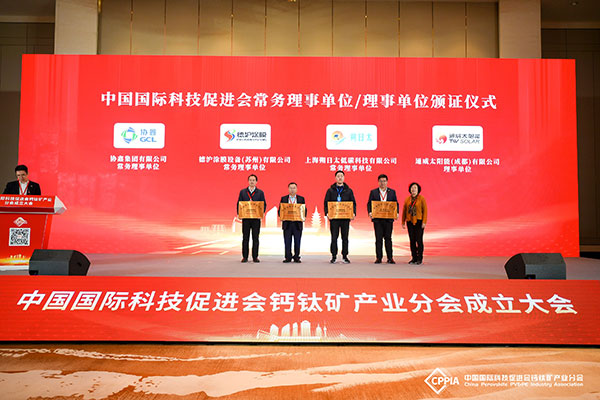 為更好地推進鈣鈦礦電池研究的快速發展,加強鈣鈦礦產、學、研的國際交流,會議期間中國國際科技促進會特別成立“中國國際科技促進會鈣鈦礦產業分會”。通威太陽能(成都)有限公司成為“中國國際科技促進會理事單位”及“科促會鈣鈦礦產業分會副會長單位”。光伏研究院院長蔣方丹博士受聘為“科促會鈣鈦礦產業分會副會長”。