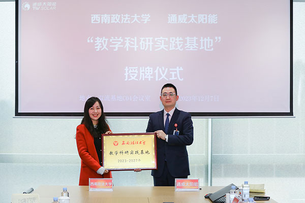 12月7日上午,西南政法大學國際法學院黨委書記呂亮、國際法學院博士李煜婕一行蒞臨通威太陽能雙流基地,與公司舉行“教學科研實踐基地”簽約及掛牌儀式。通威股份有限公司行政總監馮暢、通威股份有限公司行政部法務經理閔慧、通威太陽能總經理助理陳君、通威太陽能有限公司投資發展部(法務)副部長謝唯偉、通威太陽能人事行政部校企合作負責人等參與會議。會議由謝唯偉部長主持,雙方就“教學科研實踐基地”簽署協議并授牌,同時對后續深度合作進行了深度的交流和探討。