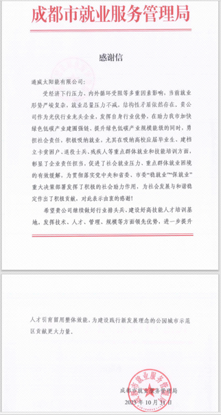 感謝信指出,受經(jīng)濟下行壓力、內(nèi)外循環(huán)受阻等多重因素影響,當前就業(yè)工作形勢嚴峻復(fù)雜,就業(yè)總量壓力不減,結(jié)構(gòu)性矛盾依然存在。但通威太陽能發(fā)揮自身行業(yè)優(yōu)勢,在協(xié)助政府推動綠色低碳產(chǎn)業(yè)規(guī)模能級提升,助力成都加快綠色低碳產(chǎn)業(yè)建圈強鏈的同時,勇?lián)鐣熑危e極吸納就業(yè),尤其在吸納高校應(yīng)屆畢業(yè)生、建檔立卡貧困戶、退役士兵、殘疾人等重點群體就業(yè)和技能培訓方面,彰顯了企業(yè)責任擔當,促進了社會就業(yè)壓力、重點群體就業(yè)困難的有效緩解,為成都市貫徹落實黨中央和省委、市委“穩(wěn)就業(yè)”“保就業(yè)”重大決策部署發(fā)揮了積極的社會助力作用,為社會發(fā)展、維護社會和諧穩(wěn)定作出了積極貢獻。