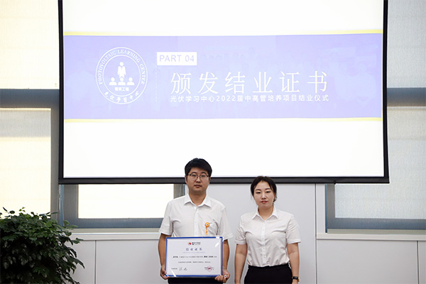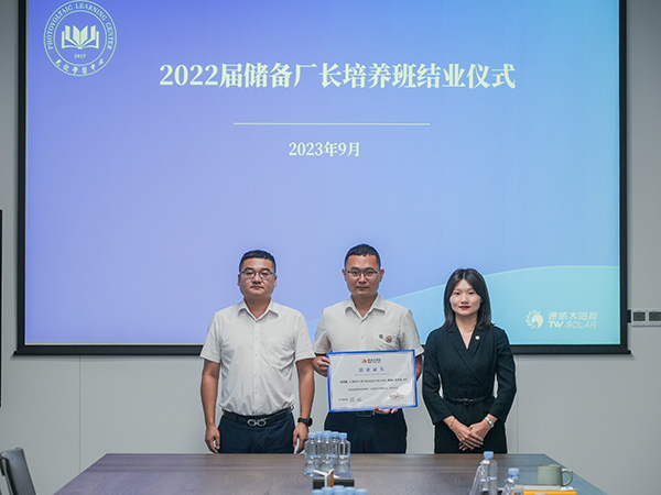 為總結(jié)回顧儲備廠長培養(yǎng)項目成果,全面展現(xiàn)儲備管理干部的快速成長成效,9月14日,通威太陽能各基地順利開展2022屆儲備廠長培養(yǎng)項目結(jié)業(yè)儀式。通威太陽能總經(jīng)理周華、總經(jīng)理助理陳君及各基地負(fù)責(zé)人攜雙流、眉山、金堂、通合四地項目導(dǎo)師及學(xué)員共同出席本次活動。