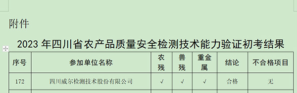 近日,公司收到《2023年四川省農產品質量安全檢測技術能力驗證初考結果》報告,四川威爾檢測在2023年四川省農產品質量安全檢測技術能力驗證中考核結果全部為合格!