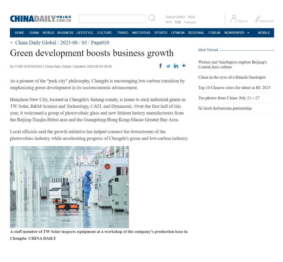 8月3日,中國日報以《Green development boosts business growth》為題,聚焦通威太陽能助力成都綠色經(jīng)濟發(fā)展,充分展現(xiàn)引領(lǐng)行業(yè)的通威速度。