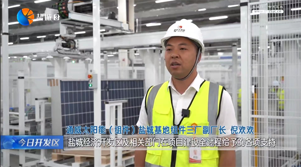 6月28日,鹽城電視臺報道《通威項目高質量投產 迸發強勁發展勢頭》專題,聚焦通威太陽能(組件)鹽城基地高質量發展,通威太陽能(組件)鹽城基地組件三廠副廠長倪歡歡接受采訪。