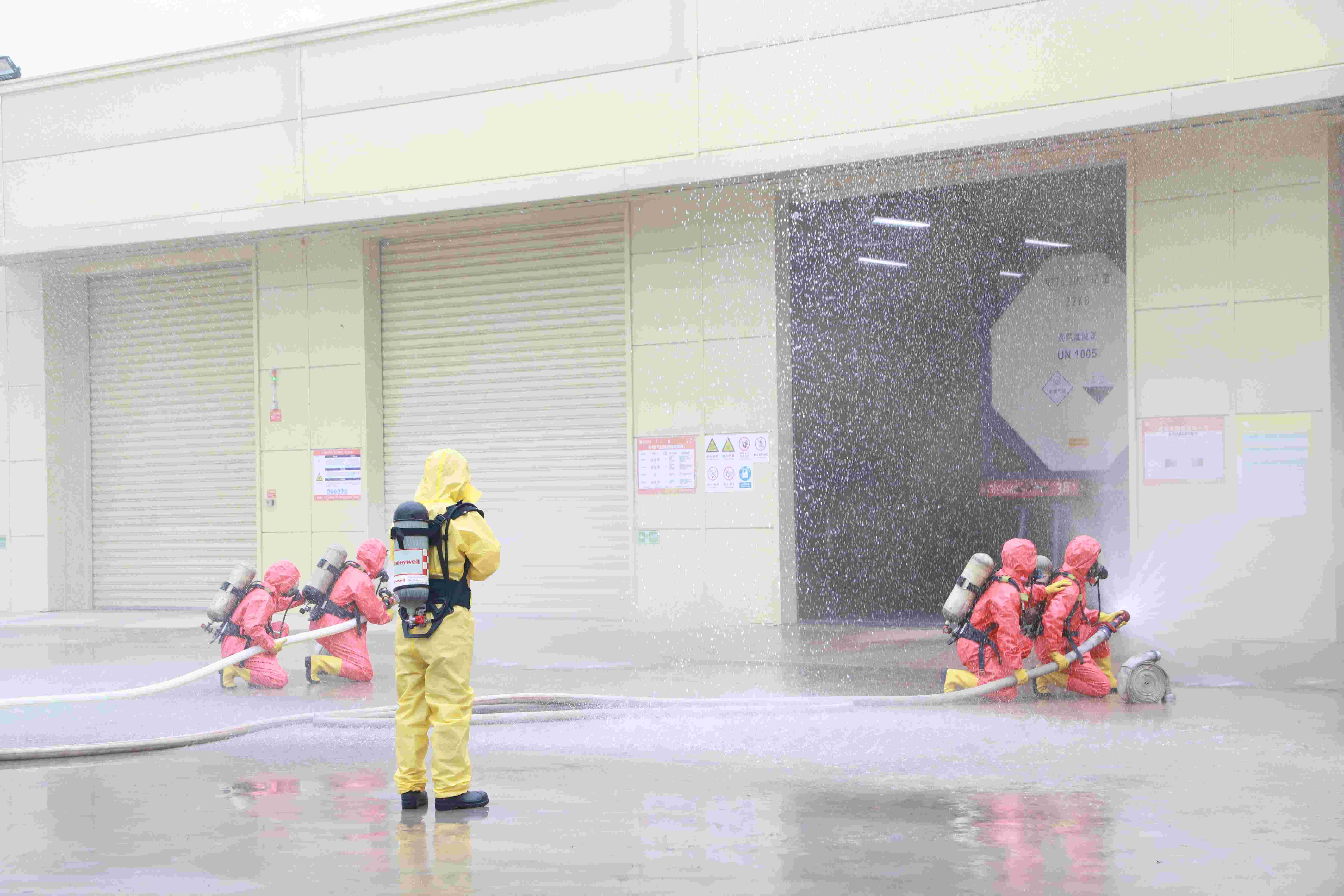 本次的演練的內(nèi)容是模擬特氣站氨氣槽車法蘭盤泄漏,由GDS系統(tǒng)報(bào)警信號(hào)開始,氣化組值班人員聯(lián)合ERC人員調(diào)取對(duì)應(yīng)監(jiān)控,發(fā)現(xiàn)站內(nèi)氨氣泄漏人員暈倒,ERC及氣化值班人員立即上報(bào)領(lǐng)導(dǎo)并進(jìn)行應(yīng)急處置,但由于泄漏點(diǎn)位于法蘭處泄露量較大,短時(shí)間內(nèi)無法控制,情況危急,現(xiàn)場(chǎng)總指揮立即啟動(dòng)公司應(yīng)急預(yù)案,疏散全廠公司人員,同時(shí)尋求金堂淮口消防隊(duì)支援。現(xiàn)場(chǎng)按照公司制定應(yīng)急預(yù)案內(nèi)容進(jìn)行搶險(xiǎn)、警戒、人員疏散和物資保障等工作。在強(qiáng)有力的組織下,消防隊(duì)員和現(xiàn)場(chǎng)搶險(xiǎn)人員的共同努力協(xié)助下,順利完成堵漏搶險(xiǎn)工作,完成了本次氨氣泄漏綜合應(yīng)急演練。