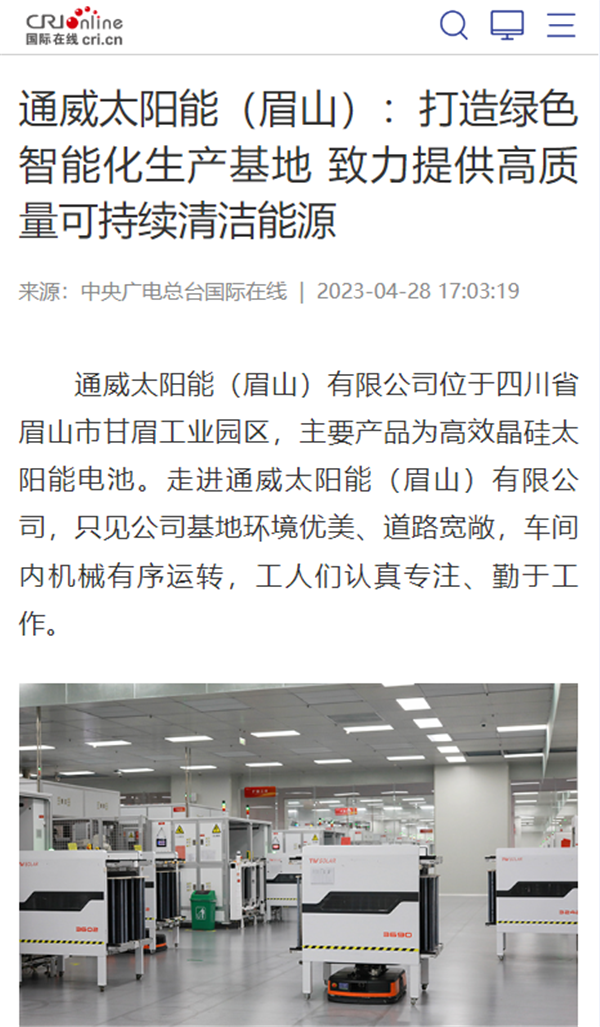 近日,中央廣電總臺國際在線發(fā)布專題報道,聚焦通威太陽能眉山基地“打造綠色智能化生產(chǎn)基地 致力提供高質(zhì)量可持續(xù)清潔能源”。