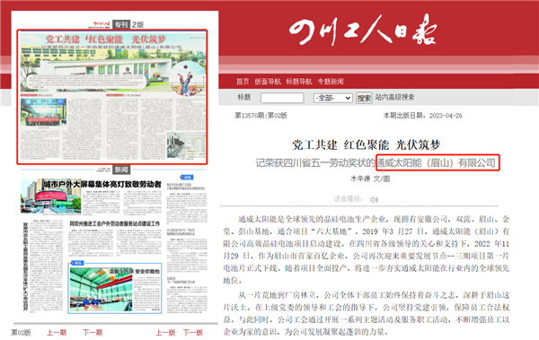 4月26日,《四川工人日報》發布一篇題為《黨工共建 紅色聚能 光伏筑夢 記榮獲四川省五一勞動獎狀的通威太陽能(眉山)有限公司》的專題報道,聚焦通威太陽能眉山基地榮獲“四川省五一勞動獎狀”。