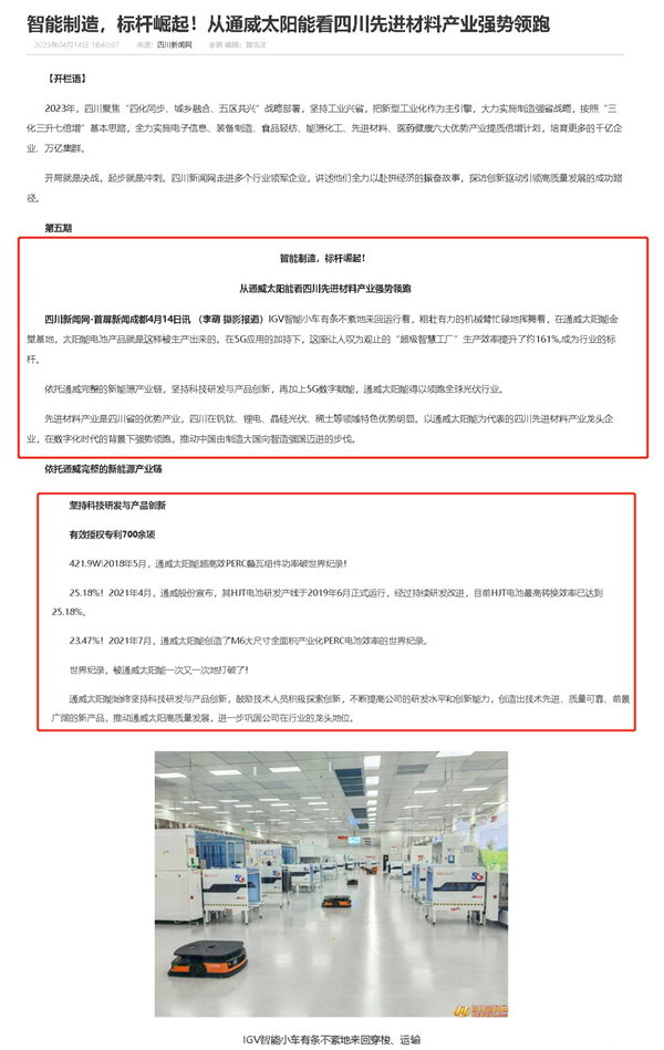 近日,四川新聞網(wǎng)以《智能制造,標桿崛起!從通威太陽能看四川先進材料產(chǎn)業(yè)強勢領(lǐng)跑》為題,聚焦通威太陽能智能制造產(chǎn)業(yè)蓬勃發(fā)展。
