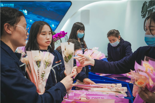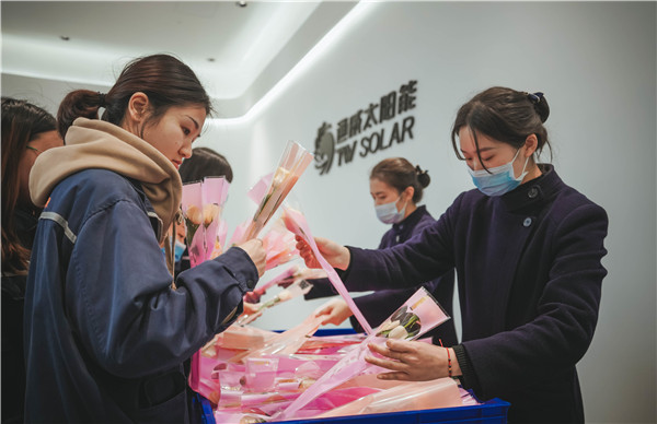 福利派送活動(dòng)現(xiàn)場(chǎng),工會(huì)載著滿滿一車鮮花和禮物駐足等待,為到場(chǎng)的女職工送上節(jié)日的祝福,祝愿各位“女神”越來(lái)越美麗、越來(lái)越順利。嬌艷的鮮花,精美的禮盒,暖心的話語(yǔ),表達(dá)著通威太陽(yáng)能工會(huì)對(duì)女職工的尊重與感謝。大家捧著溫馨精致的禮盒,沉浸在一片溫情愉快的節(jié)日氛圍中,紛紛感謝公司的誠(chéng)摯慰問(wèn),并表示將積極投身到工作之中,為公司的發(fā)展添磚加瓦,展示巾幗之風(fēng)。
