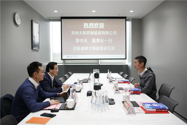 3月1日,蘇州太陽井新能源有限公司董事長李中天博士一行到訪通威座談交流,通威股份光伏技術(shù)部總監(jiān)王秀鵬熱情接待并座談,通威太陽能(成都)有限公司銅互聯(lián)試驗線廠長蘇世杰陪同接待。