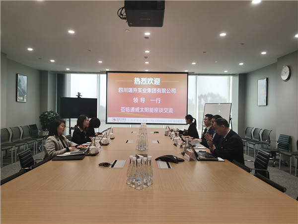 2月24日,四川瑞升實業集團有限公司財務總監王馨顏一行蒞臨通威太陽能雙流基地座談交流,通威太陽能副總經理宋梟熱情接待并座談。