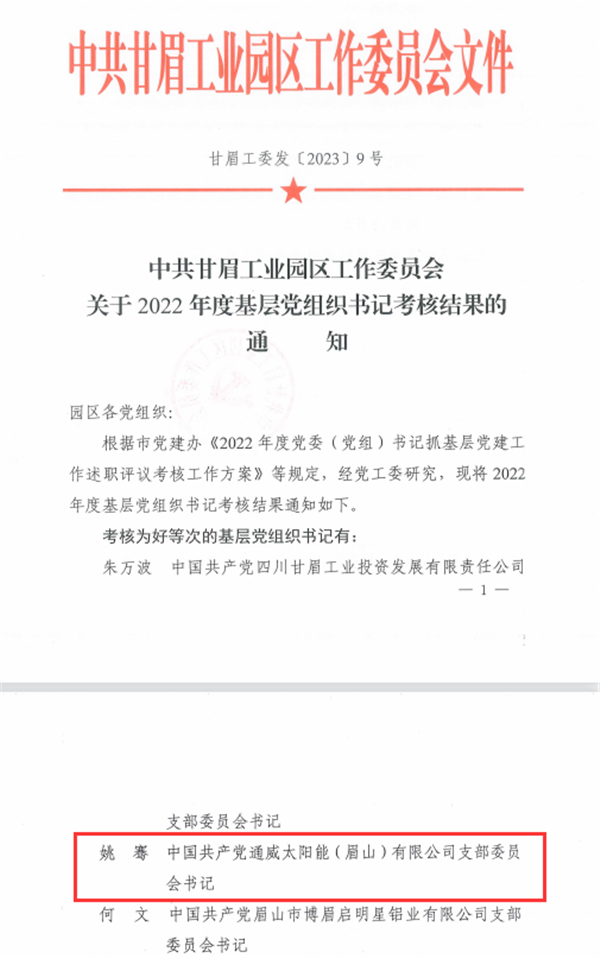 近日,通威太陽能眉山基地黨支部書記、總經理助理姚騫被評為“2022年度甘眉工業園區優秀基層黨組織書記”,對其過去一年在黨建發展、團隊管理所付出的努力與取得成果給予認可與肯定。