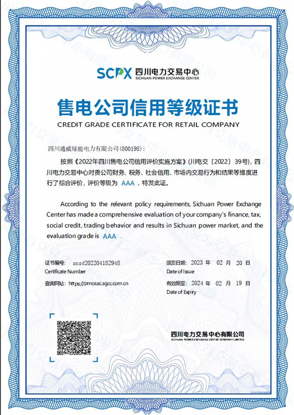 信用是市場的基礎(chǔ)。習近平總書記強調(diào),要完善社會信用等市場經(jīng)濟基礎(chǔ)制度,為各類經(jīng)營主體投資創(chuàng)業(yè)營造良好環(huán)境,激發(fā)各類經(jīng)營主體活力。作為通威集團旗下綜合能源服務商,四川通威綠能電力有限公司始終秉持“誠、信、正、一”的經(jīng)營理念,在四川電力交易中心對全川售電公司的信用評價中喜獲AAA這一最高評級,全川僅有2%的售電公司獲此殊榮。