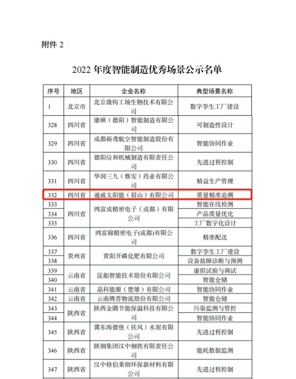 通威太陽能眉山基地榮列“2022年度智能制造優秀場景”名單