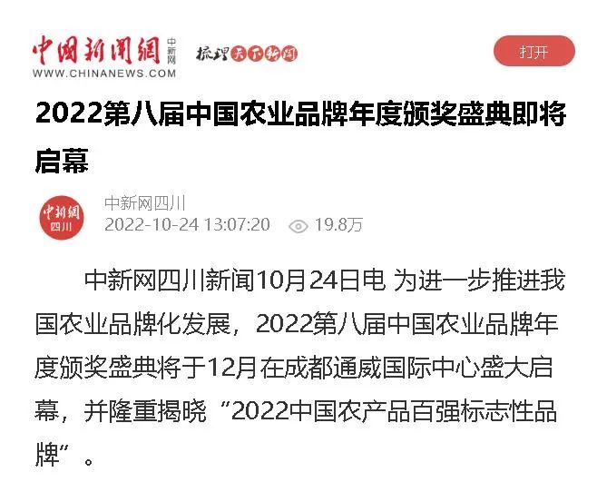 12月,2022第八屆中國農業品牌年度頒獎盛典將于成都通威國際中心盛大啟幕。隨著盛典日益臨近,人民網、中國新聞網、中國經營網、經濟觀察網、四川新聞網等主流權威媒體及行業媒體紛紛聚焦本屆盛典籌備情況,多維度見證中國農業品牌成長蛻變。
