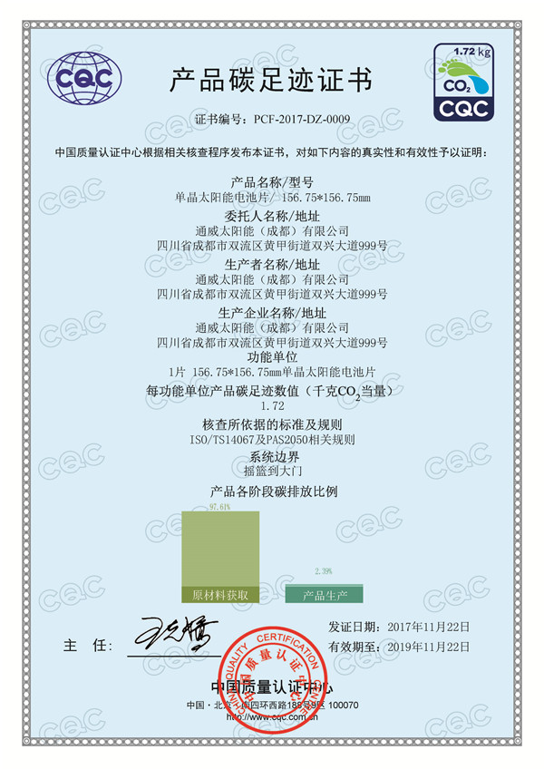 2017年11月,通威太陽(yáng)能獲得由中國(guó)質(zhì)量認(rèn)證中心(CQC)頒發(fā)的CQC產(chǎn)品碳足跡證書,充分證明了通威太陽(yáng)能公司走在行業(yè)前列,支持中國(guó)乃至世界的太陽(yáng)能光伏事業(yè),打破國(guó)際綠色貿(mào)易堡壘的具體行動(dòng),進(jìn)一步增強(qiáng)了通威太陽(yáng)能的國(guó)際競(jìng)爭(zhēng)力。