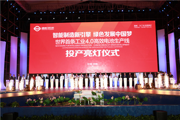 2017年9月20日,通威太陽(yáng)能世界首條工業(yè)4.0高效電池生產(chǎn)線投產(chǎn)亮燈儀式隆重舉行。通威集團(tuán)董事局劉漢元主席與35位重磅嘉賓共同啟動(dòng)亮燈儀式,標(biāo)志著通威“智能制造新引擎 綠色發(fā)展中國(guó)夢(mèng)”征程的全新啟航。